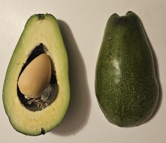 Ci dessous un 1er fruit d’Aravaipa récolté en France, en Provence, manquait de maturité: « Meilleur que Zutano, moins bon que Hass, pas assez mûr pour le départager avec Bacon »